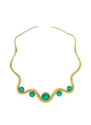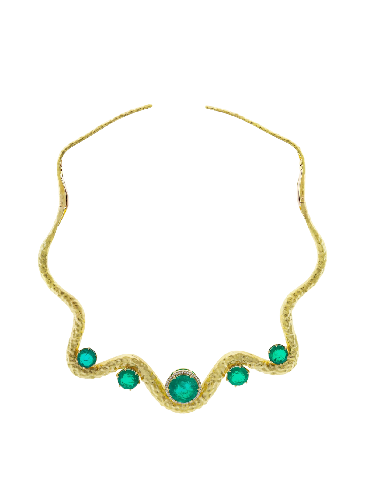 Emeralds punctuate the composition like points of focus, guiding the eye along a fluid, architectural line. The piece sits with quiet confidence, structured, intentional, and complete. A deliberate arrangement of form and colour, where structure becomes the statement. The result is a piece that feels modern, timeless, and feminine.